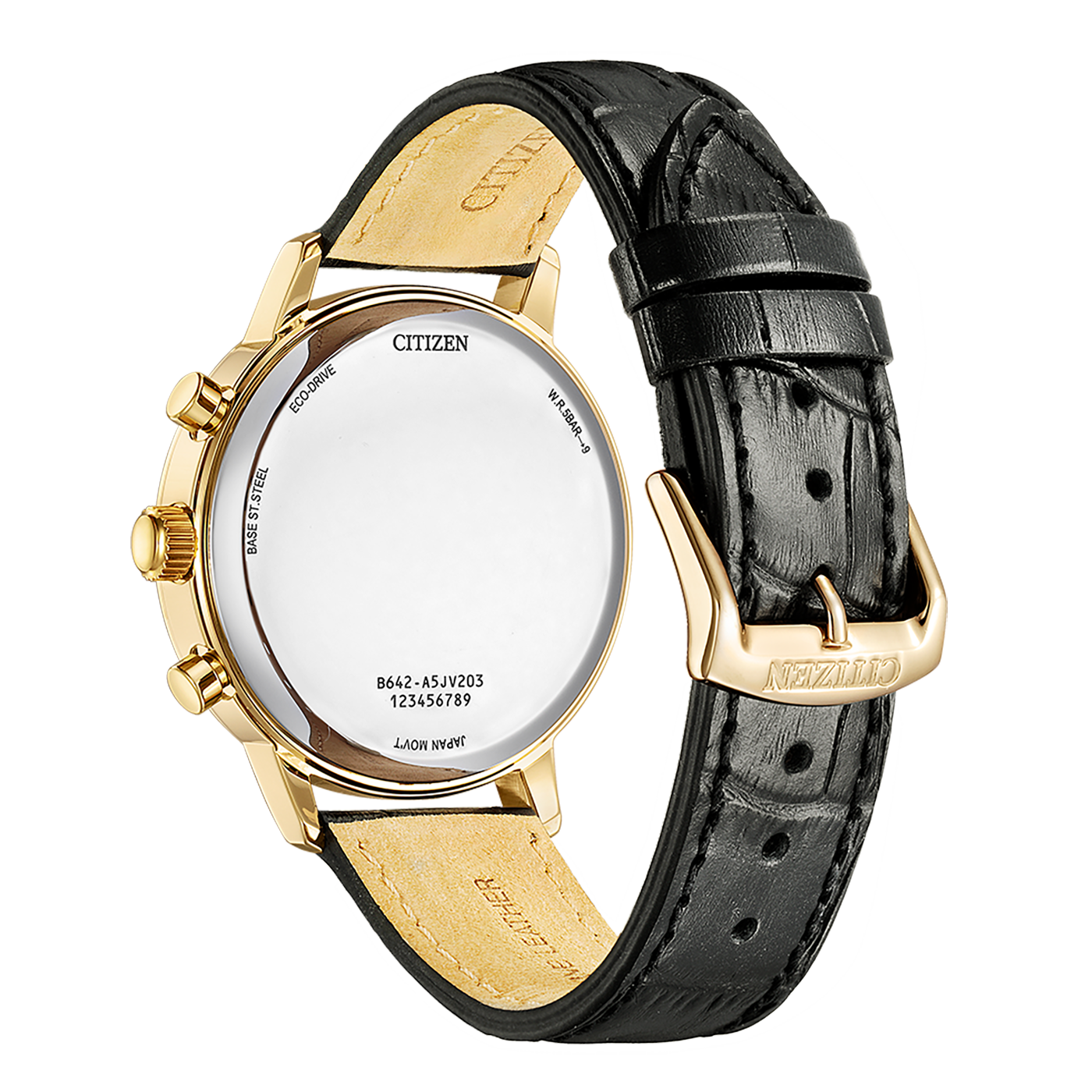 Classic chronograph with gold-colored stainless steel case, dark brown leather strap, crystal glass and white dial. Equipped with caliber B642 with Eco-Drive power mechanism, stopwatch function, date and 5 bar water resistance. Case diameter: 42 mm, strap lug width: 20 mm.