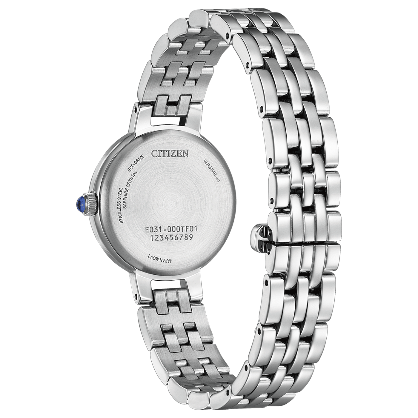 Powered by the Eco-Drive calibre E031, the watch features a battery discharge indicator and a power reserve of up to 180 days – no battery replacement is necessary. The scratch-resistant sapphire glass keeps the dial safe, while the solid stainless steel strap with a double push clasp keeps it safe.
