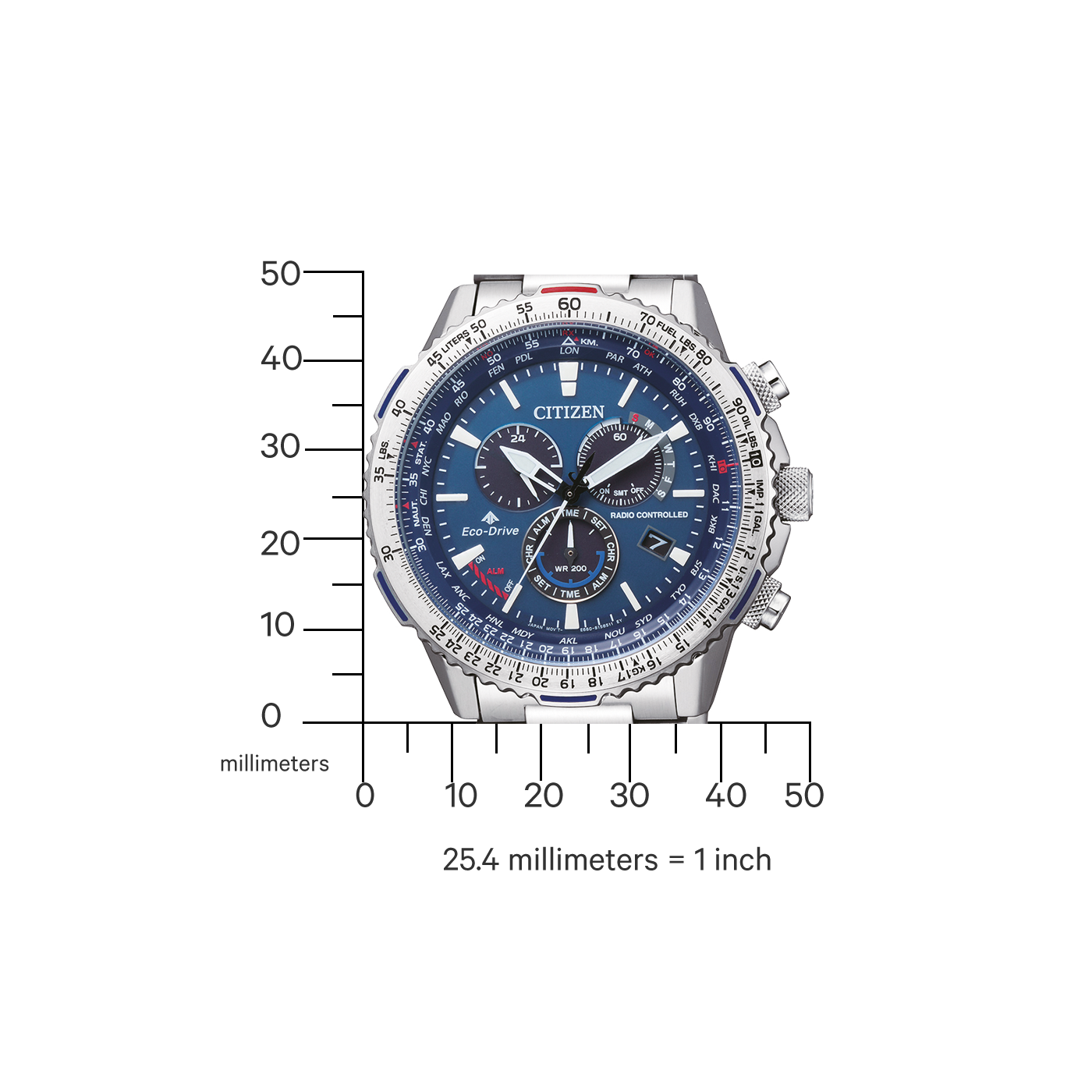 Stopwatch: max.60 min,1/1 sec, 3 years, Radio controlled clock - EUR, JPY, USA, China, 300 days, Eco-Drive, Energy reserve display, Perpetual Calender, Battery discharge indicator, Daily Alarm, Day/D