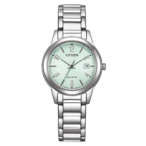 Το μοντέρνο γυναικείο ρολόι FE1241-71X διαθέτει κάσα και μπρασελέ από ανοξείδωτο ατσάλι, κρύσταλλο ορυκτού και παστέλ πράσινο καντράν. Εξοπλισμένο με το μηχανισμό Caliber J710 και το σύστημα Eco-Drive (Ring Solar), προσφέρει, επίσης, ένδειξη ημερομηνίας και αντοχή στο νερό έως 3 bar.